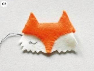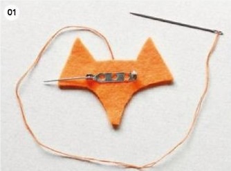 01 Kalıbı kullanarak turuncu renkli keçeden iki sevimli tilki kafası şeklinden ve krem keçeden tilki ağzı için bir tane kesin. Keçenin rengine uyumlu iki katlı iplik kullanarak, broş iğnesini turuncu parçalardan birinin arkasına tutturun.