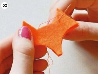 02 İki turuncu şekli mükemmel bir şekilde üst üste gelecek şekilde hizalayın ve tek katlı iplikle bıçak dikişi kullanarak kulakların çevresini dikkatlice dikin.