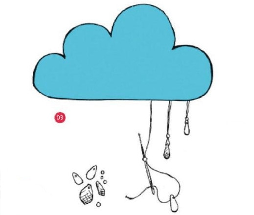 03 Her küçük bulutun alt kenarı boyunca 2-3cm aralıklarla yedi cam yağmur damlası dikin. Gümüş iplikle bir iğne geçirin ve dikiş hattına sabitleyin. Boncuğu ekleyerek bir cam yağmur damlası olurturun. İğneyi yuvarlak boncuktan geri alın ve başlangıç noktasına tekrar sokun. İplik 5-8 cm uzunluğa ulaşana kadar sırtı çekin. İki küçük dikişle sabitleyin, ardından iğneyi buluttan geri geçirin ve bir sonraki boncuk için hazır olarak dikiş hattı boyunca 2-3 cm daha dışarı çıkarın. En büyük boncuğu merkeze asın.