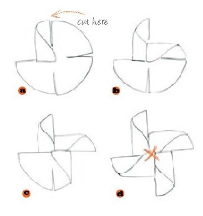 - Şekil A'da gösterildiği gibi, her daireye eşit aralıklarla 3 cm'lik dört kesim yapın. Her seferinde bir daire alarak ve saat yönünde çevirerek, her çeyreğin bir tarafını ortaya doğru katlayın, ortada üst üste geldiklerinden ve yerinde durduklarından emin olun. Dört parçanın tümü dekatlandığında, şekil D'de gösterildiği gibi zıt renk bir iplikle çapraz dikişlerle ortadan sabitleyin.